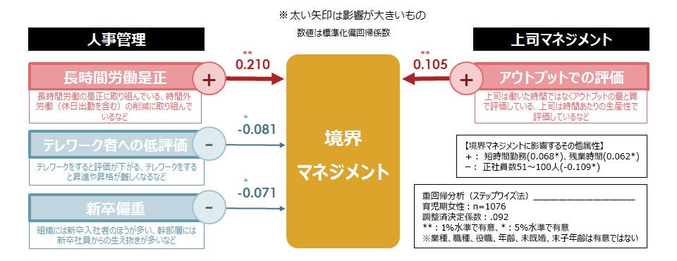 「長時間労働是正」や上司による「アウトプットでの評価」が部下の育児期女性の境界マネジメントの実践に特に影響している。正社員全体と比べるとアウトプットでの評価が強く影響していることが特徴。