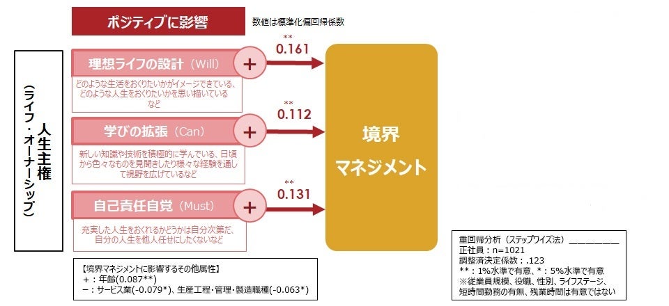 11. 「理想ライフの設計(Will)」、「学びの拡張(Can)」、「自己責任自覚(Must)」の3つの要素が境界マネジメントの実践にプラスに影響。