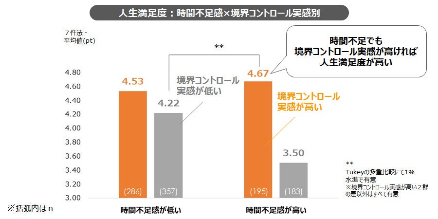 1. 時間不足感を解消することよりも、境界コントロール実感を高めることが人生満足度とプラスに関連している。