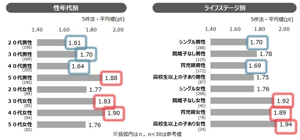 ライフステージ別:既婚子なし女性や子あり女性で高く、シングル男性や育児期男性で低い。