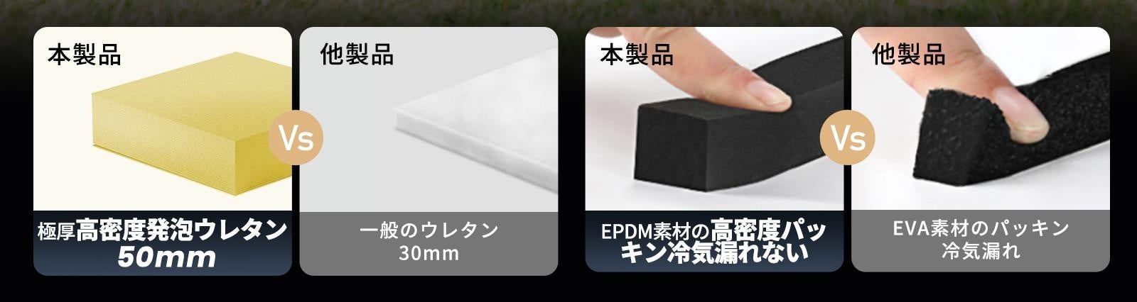 また、厚さ50mmの高密度発砲ウレタンを採用しており、保冷効果も抜群です。パッキン部分には耐久性に優れたEPDM素材を使用しており、長く安心してお使いいただけます。