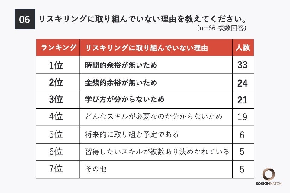「Q6.(Q5で『取り組んでいない』と答えた方に対して)リスキリングに取り組んでいない理由を教えてください(複数選択可能)」という質問をしたところ、「時間的余裕がないため」という理由が最も多く挙げられ、33票となりました。次いで「金銭的余裕がないため」が24票、「どのようにして学んだら良いのかわからないため」が21票となっています。