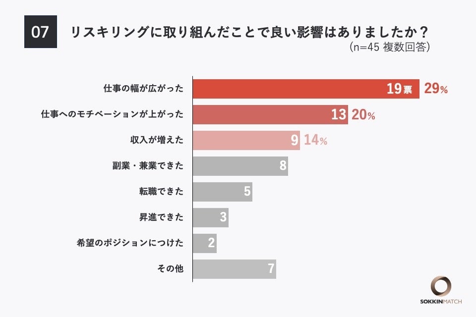 「Q7.(Q5で『取り組んでいる』『過去に取り組んでいた』と答えた方に対して)リスキリングに取り組んだことで良い影響はありましたか?(複数選択可能)」という質問をしたところ、「仕事の幅が広がった」と回答した人が最も多く、19票となりました。次いで「仕事へのモチベーションが上がった」が13票、「収入が増えた」が9票となっています。