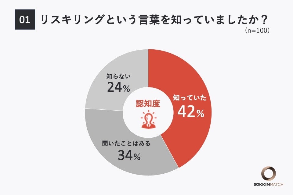 「Q1.リスキリングという言葉を知っていましたか?」という問いに対して、「知っている」と回答した人は全体の約4割に留まりました。その他は「聞いたことはある」と回答した人が34%、「知らない」と回答した人が24%という結果となりました。