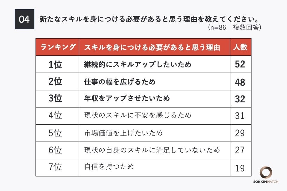 「Q4.(Q2で「とてもそう思う」「どちらかといえばそう思う」と答えた人に対して)将来的に新たなスキルを身につける必要があると思う理由を教えてください(複数選択可能)」という質問をしたところ、「継続的にスキルアップしたいため」と回答した人が最も多く、52票となりました。次いで「仕事の幅を広げるため」が48票、「年収アップさせるため」が32票となっています。