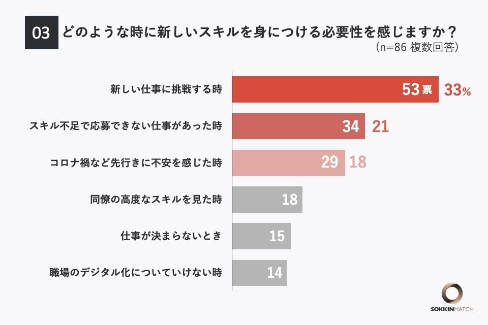 という質問をしたところ、「新しい仕事に挑戦する時」と回答した人が最も多く、33%となりました。次いで「スキル不足で応募できない仕事があった時」が21%、「コロナ禍など先行きに不安を感じた時」が18%となっています。