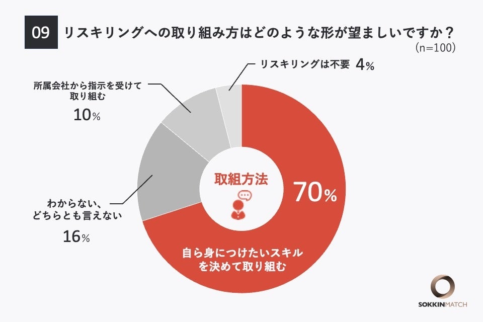 「Q9.リスキリングへの取り組み方はどのような形が望ましいですか?」という問いに対して、「自ら身につけたいスキルを決めて取り組む」と回答した人が最も多く、70%という結果となりました。次いで「わからない、どちらともいえない」が16%、「所属会社から指示を受けて取り組む」が10%となっています。