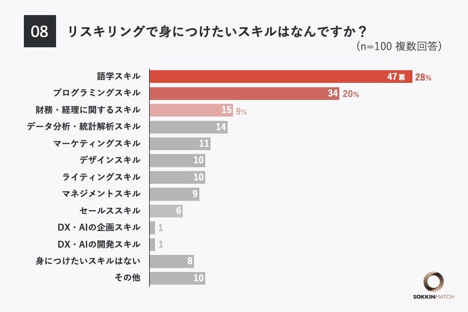 「Q8.リスキリングで身につけたいスキルor(現在リスキリングを行っている方は)現在リスキリングで学んでいるスキルは何ですか?(複数選択可能)」という問いに対して、「語学スキル」と答えた方が最も多く、47票となりました。次いで「プログラミングスキル」が34票、「財務・経理に関するスキル」が15票となっています。