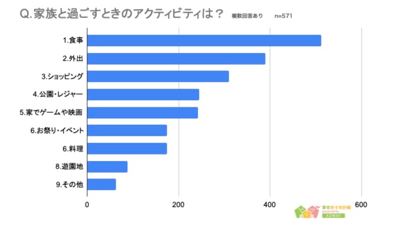 続いて、「家族と過ごすときにどのようなアクティビティをするか」について聞いたところ、1位は「食事」で512人、2位は「外出」で390人、3位は「ショッピング」で310人という結果になりました。日常で必ずあると言っても良い「食事」を家族の時間に充てている人が多いことがわかります。