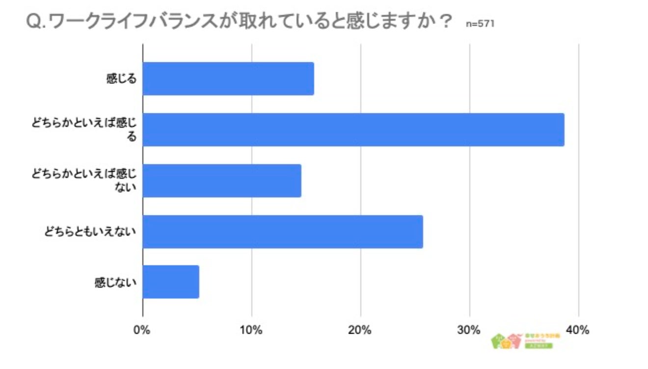 最後に「ワークライフバランスが取れていると感じるか」について聞いたところ、「感じる」と答えた人は90人で全体の15.8%、「どちらかといえば感じる」と答えた人は221人で38.7%という結果になりました。一方、「どちらかといえば感じない」は83人で14.5%、「感じない」は30人(5.3%)で、ワークライフバランスが取れていると感じている人の方が多いとわかります。