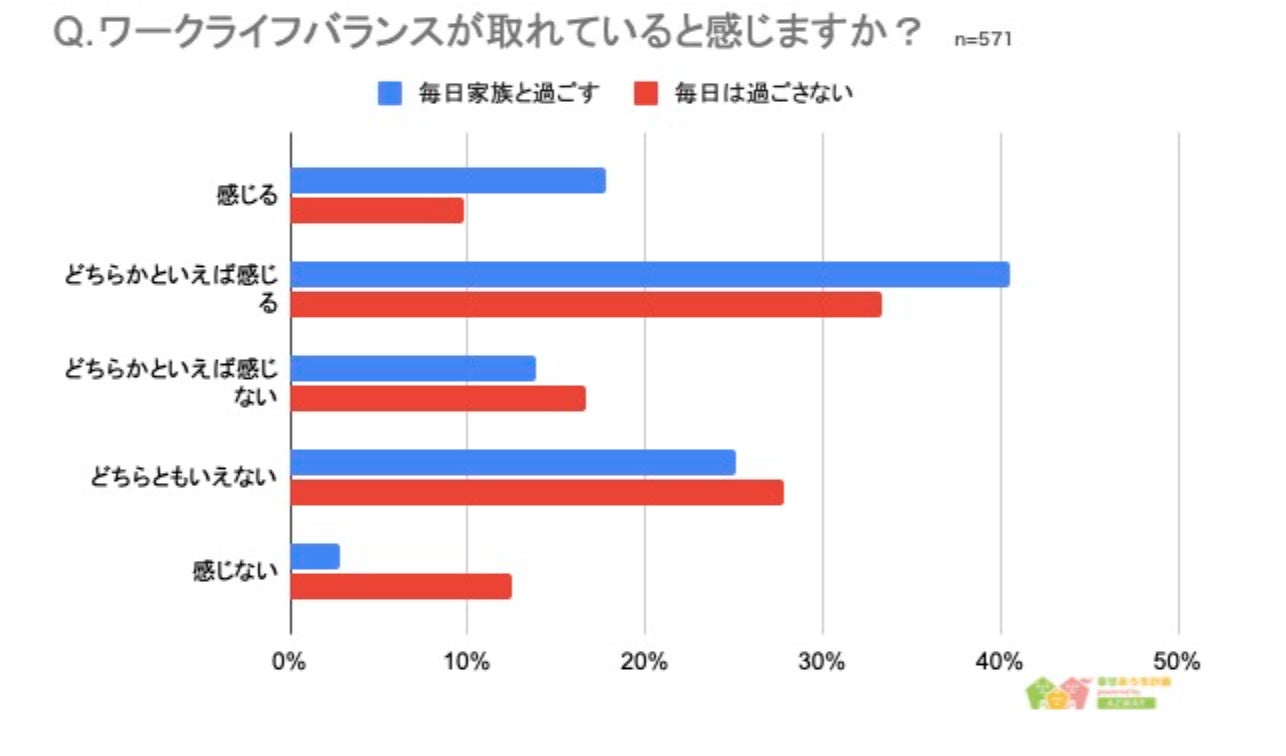 最後に、「ワークライフバランス」について尋ねたところ、全体の54.5%の人が「取れていると感じる・どちらかといえば取れている」と感じているという結果に。一方で、家族と過ごす時間の長さによってワークライフバランスの感じ方に違いが出ており、毎日家族といる人は、家族と過ごす時間が少ない人より「ワークライフバランスが取れている」と感じていることがわかりました。