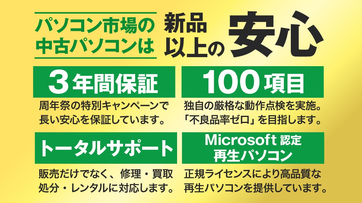 ※購入特典は周年祭店舗の店頭でのみ提供されている特典になります。※1)訳あり商品を除く。※2)身分証明書と印鑑が必要。パソコンを1台のご購入につき、パソコン1台。※3)商品の状態・スペック・付属ソフトの内容により、下取価格は変動します。※4)パソコン購入時に限る。ご利用中のパソコンを店頭にお持ちください。正常に動作するパソコンのみ。作業内容により、お預かりとなる場合があります。※5)パソコン購入から1カ月以内に限る。お一人様1回のご利用が可能。ご相談内容によって、お時間が掛かる場合は有料となります。また、問題解決をお約束するものではありません。