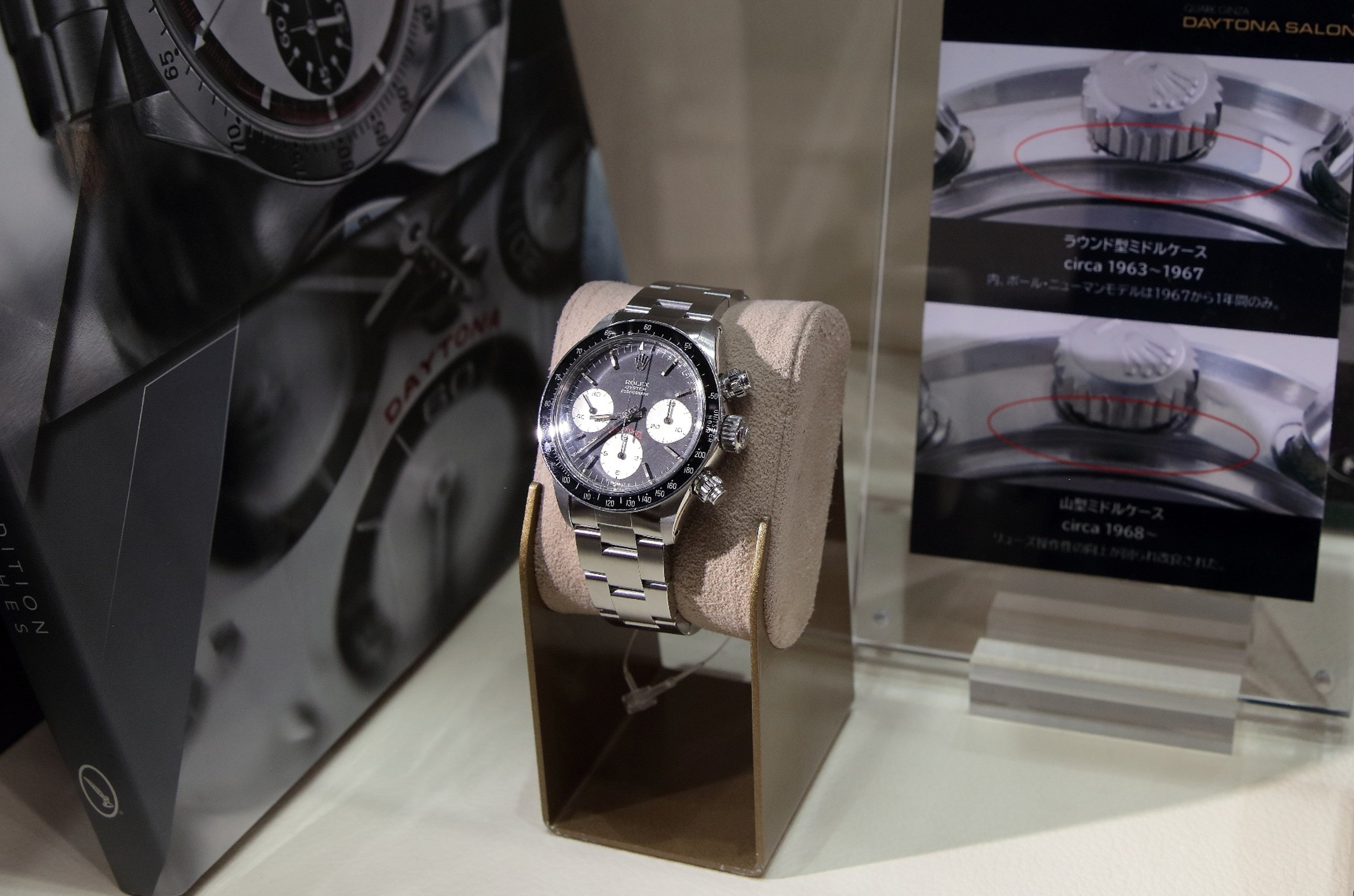 ロレックス専門店として30年近い歴史があるクォークにおいても、特定モデルだけを集めた店舗は同店が初めて。最新モデルのRef.126500LNはもちろん、定番のアイスブルーから希少なレインボー、ル・マン、メテオライトのみならず、トリプルカレンダー機能を搭載した幻のプレ・デイトナRef.6036キリーなど、約200本のデイトナが勢ぞろいしています。