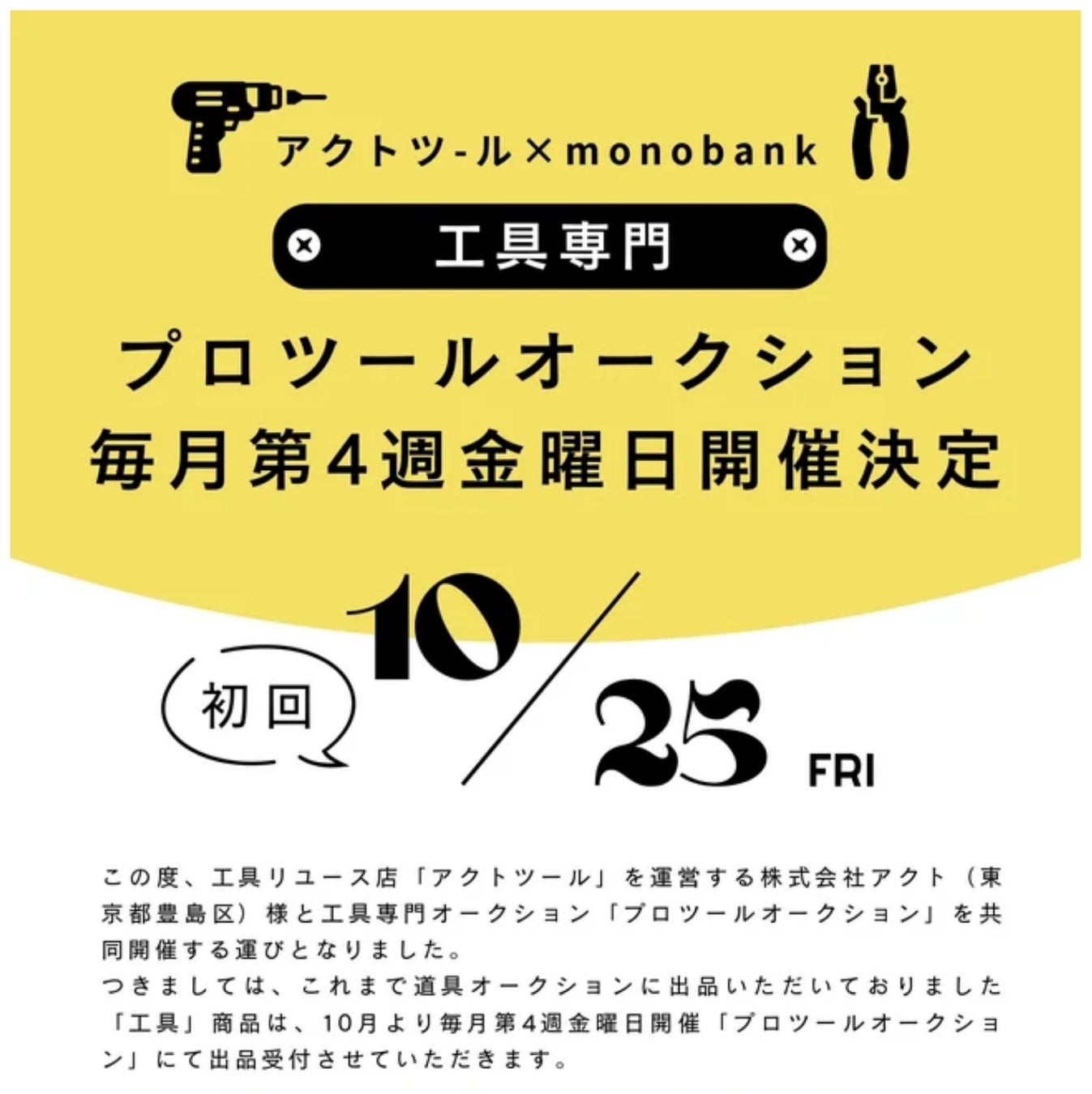 業界初、工具専門の古物市場「プロツールオークション」開催決定!【アクトツール×monobank 共同開催】