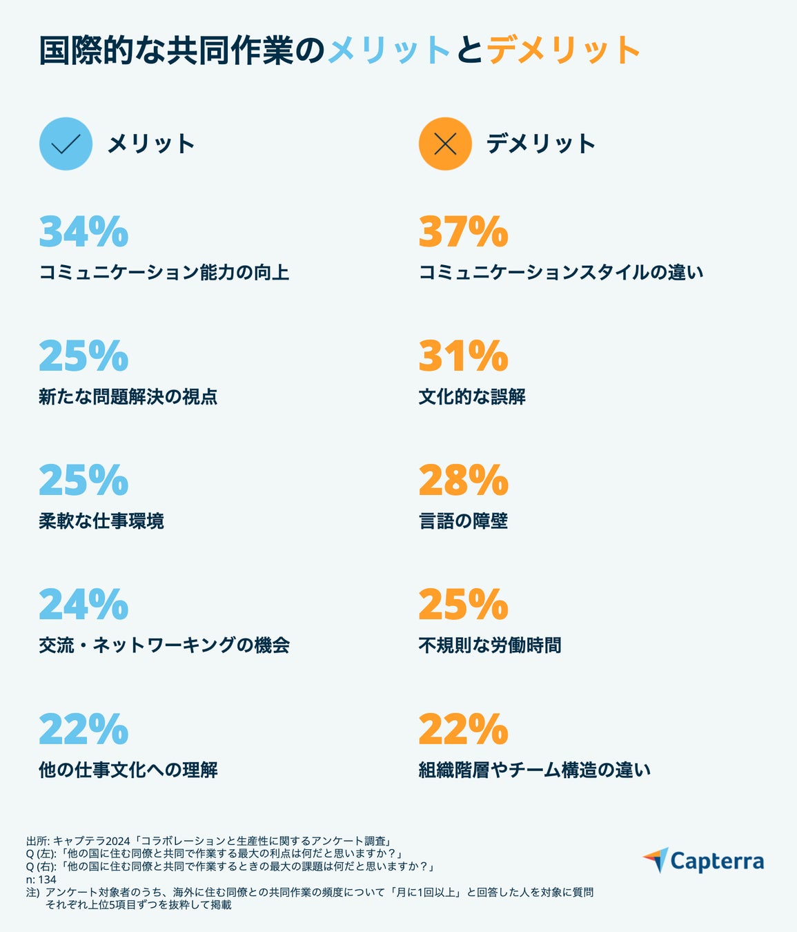 先ほどの質問で「月に1回以上」海外にいる従業員と共同で作業すると答えた人に、そういったグローバルコラボレーションのメリットとデメリットを聞きました。