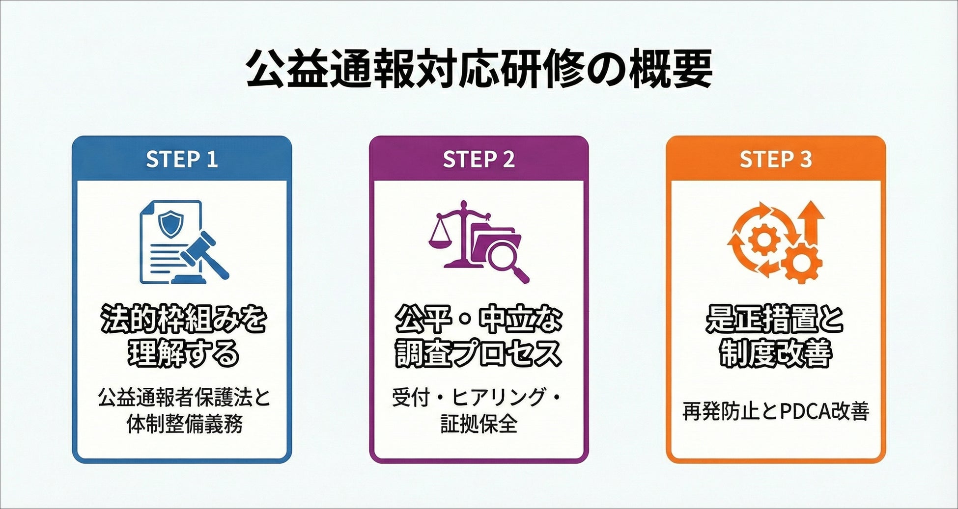 本研修では、公益通報制度の法的基盤の理解から、通報受付、調査、そして制度の継続的改善まで、一連のプロセスにおける実践力を強化します。