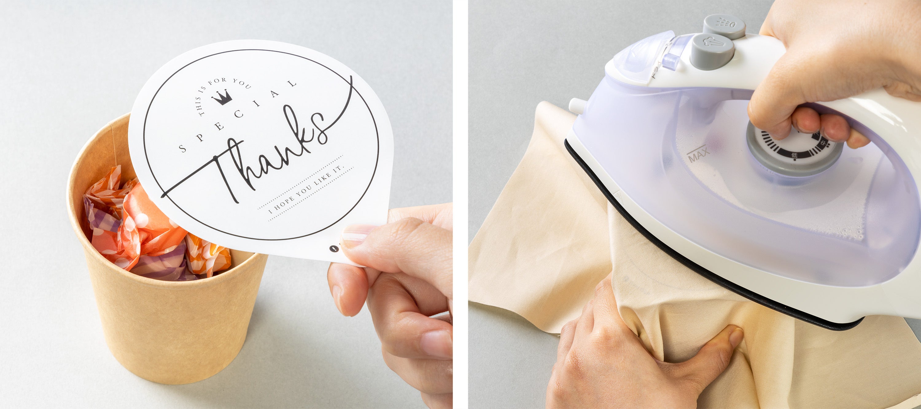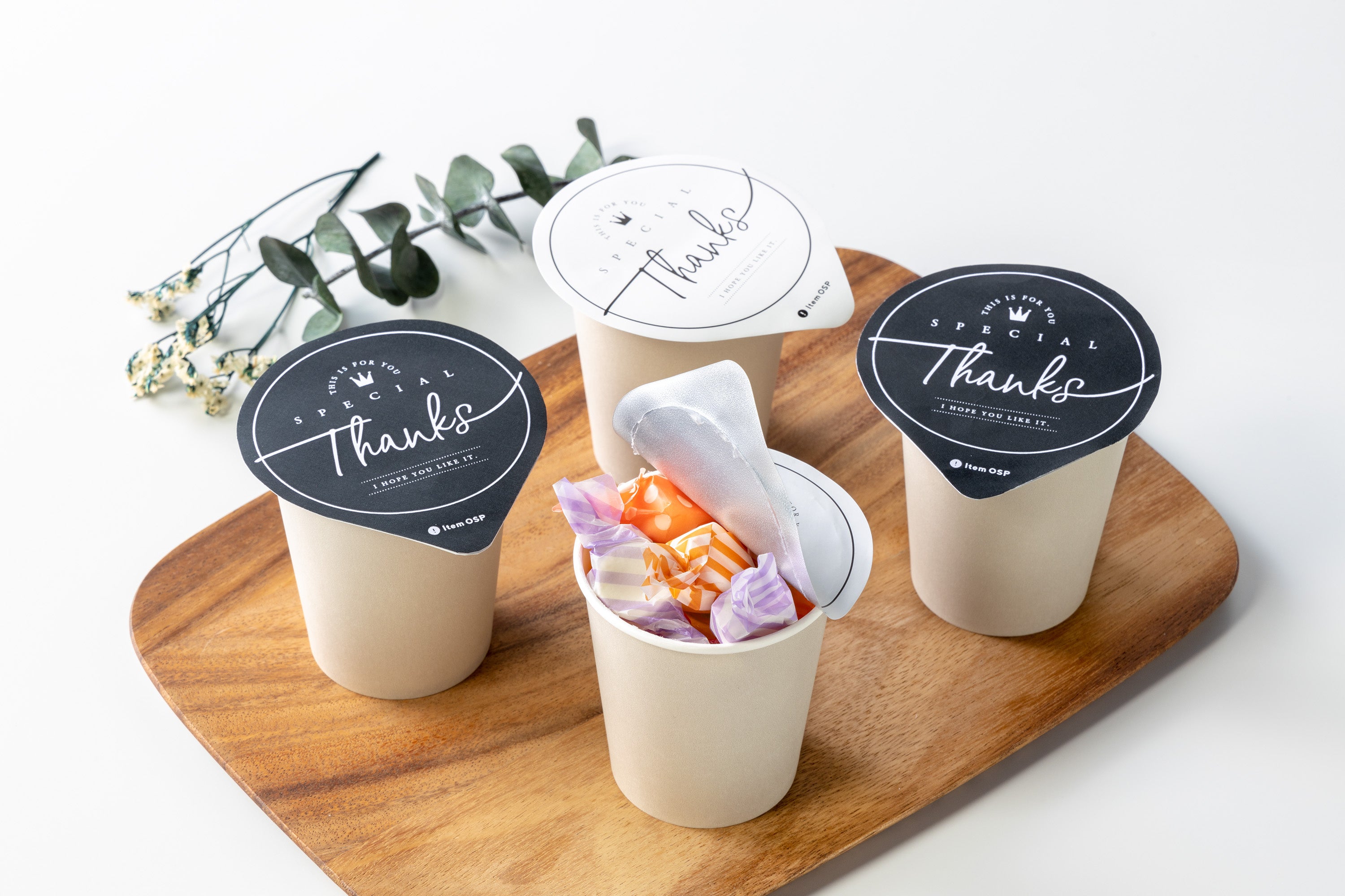 紙コップやプラスチックのクリアカップの中に小物や個包装されたお菓子などを入れて、本製品を被せてアイロンでヒートシールできる蓋状の製品です。蓋としての機能に加えてデザイン性も高く、メッセージを書き込むことができます。プレゼントのラッピングや、個包装のお菓子(二次包装推奨)の小分けアイテムとしてご利用いただけます。