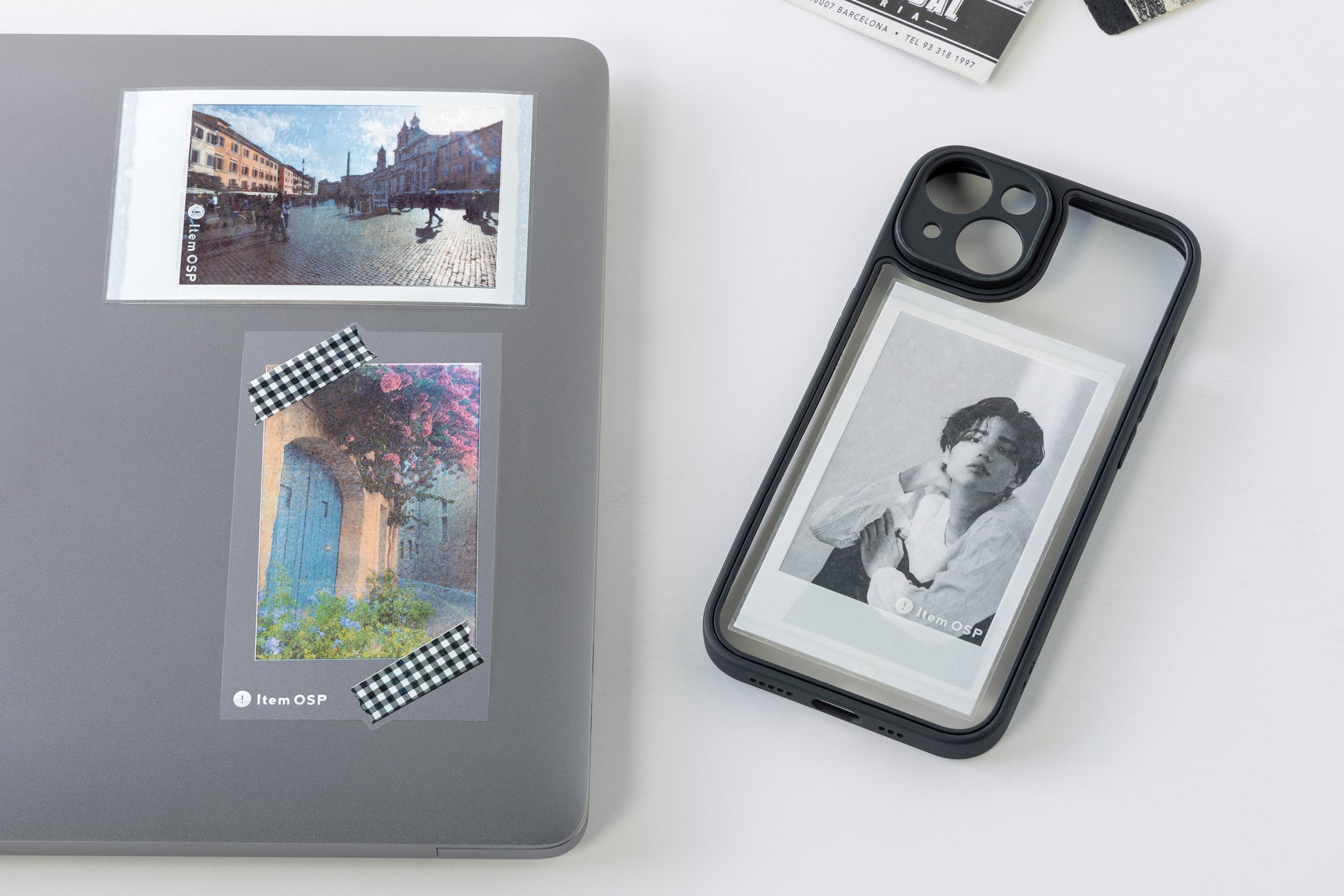 本製品は、名古屋外国語大学世界共生学部(愛知県日進市)の学生との共同企画により製品化しました。「絵画の額縁のようなシール」というアイデアからスタートして、お気に入りの写真をスマートフォンに貼る際や、写真をデコレーションするときのアイテムとして開発に至りました。インスタントカメラで撮影したお気に入り(推し)の写真やカードの上から本製品を貼ると、表面をきれいに保護すると同時にデコレーションもできるシールです。あらかじめデザインが印刷されているので手軽にデコレーションができるほか、透明フィルム素材なので上から色を塗ったり文字を書き込んだりすることもできます。スマートフォンの背面や手帳、スクラップブックなどに貼ってご使用いただくシールです。