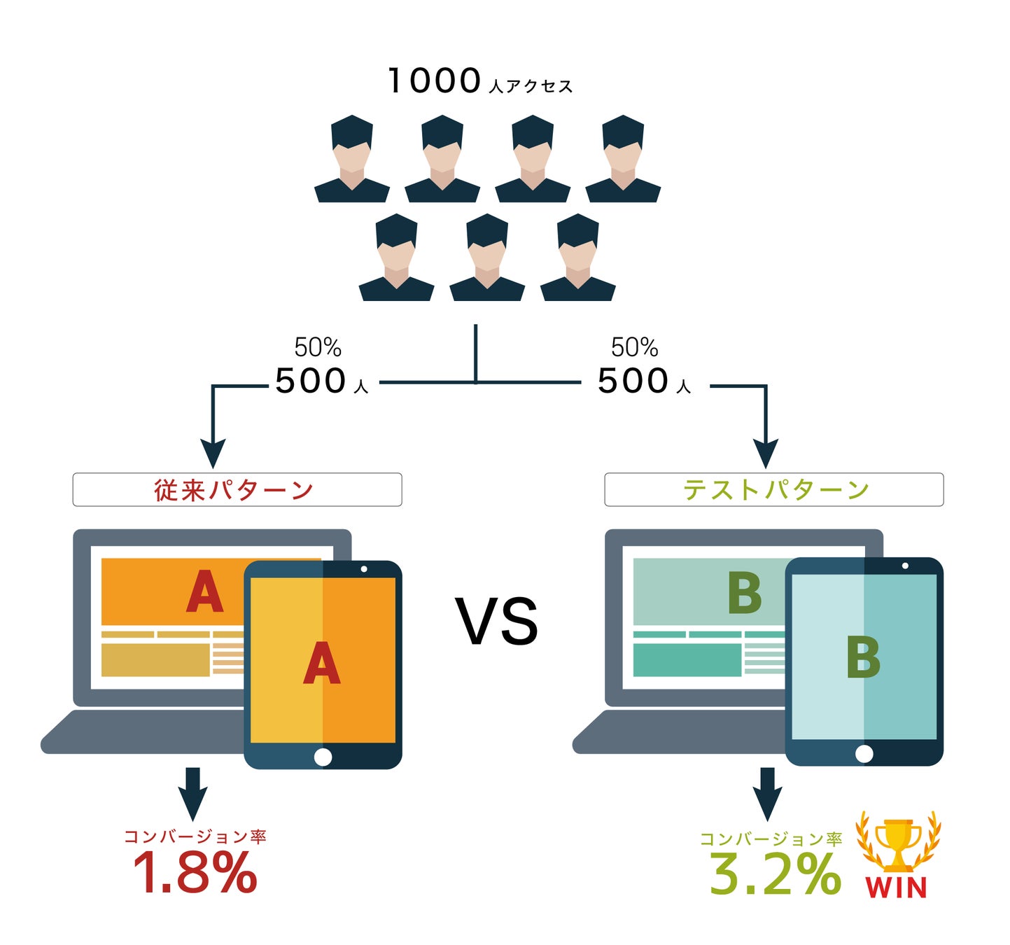 AとBの2つのパターンを用意し、実際のWEBサイトで、どちらがクリックが多かったか等を検証するテストです。テストの結果からコンバージョン率を上げるパターンを知ることで、感覚的な判断に頼ることなく、ユーザーが求める”答え”を知ることができます。