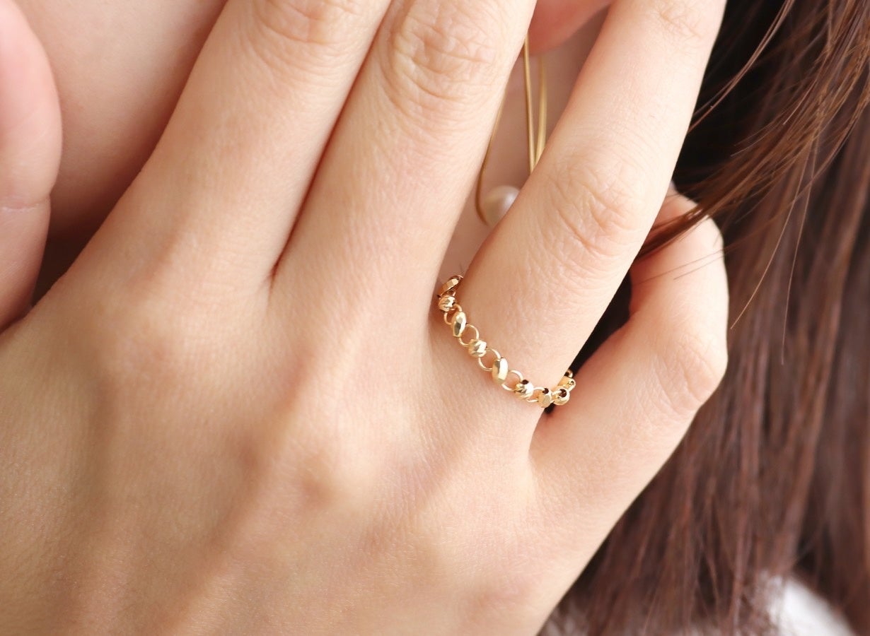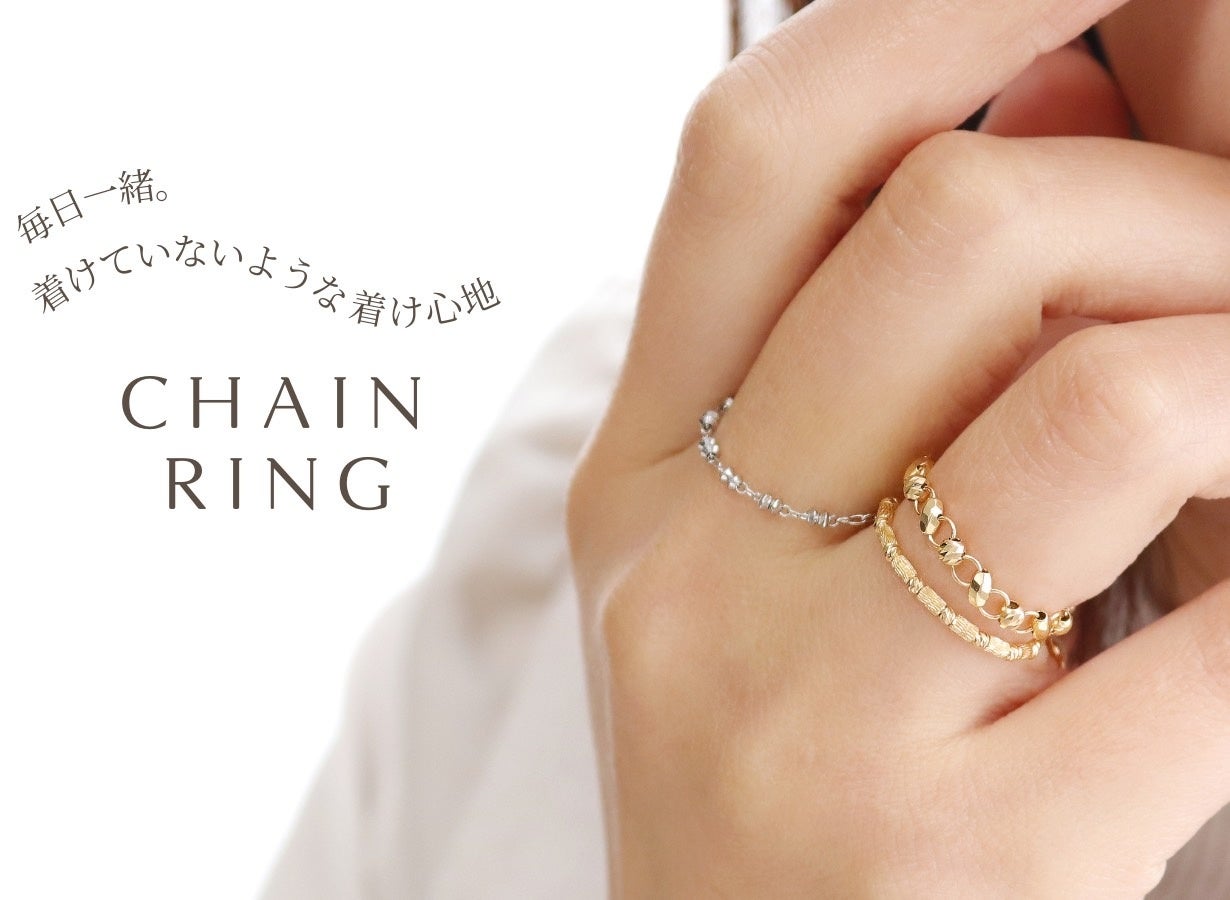 チェーンは通常、ネックレスなどに使用されることが多いですが、英語の「chain」の意味=鎖、つながり。そこから連想される、絆や永遠などのイメージから、パートナーや友人と一緒にリングにして身に着けるのもおすすめです。