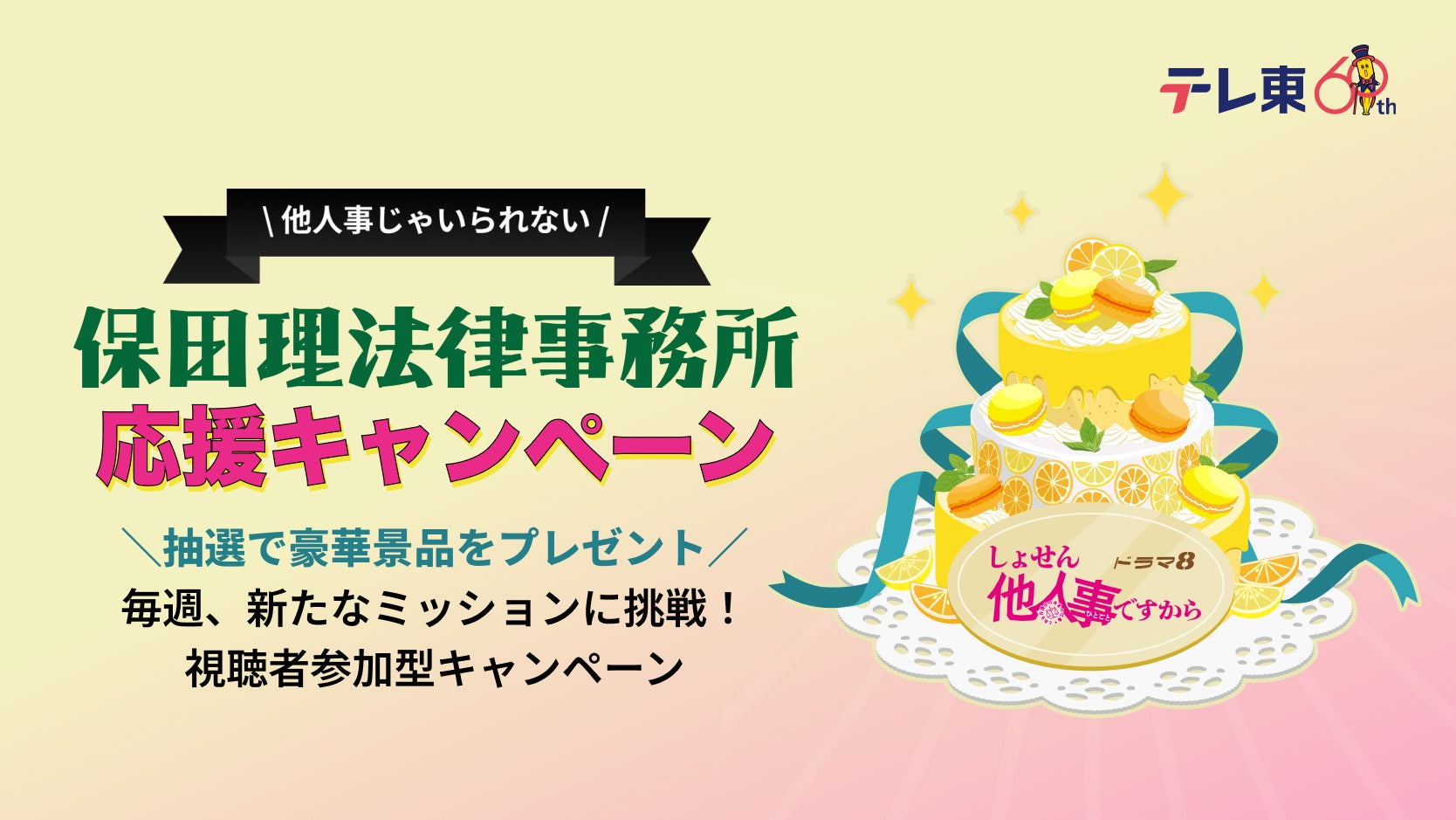 初回の放送を直前に控えた7月15日(月)より「\他人事じゃいられない/ 保田理法律事務所応援キャンペーン」を実施いたします。ドラマの放送期間中(7月19日〜)に毎話の放送タイミングで発表されるミッションをクリアするごとに、中島健人演じる保田理弁護士の大好物であるスイーツ作りを進められるというもの。さらに本キャンペーンへの参加者が多ければ多いほど、豪華な巨大スイーツを実際にドラマ出演者に差し入れすることができます。ぜひ本キャンペーンに参加し、ドラマ放送期間中に保田理法律事務所を応援してください。