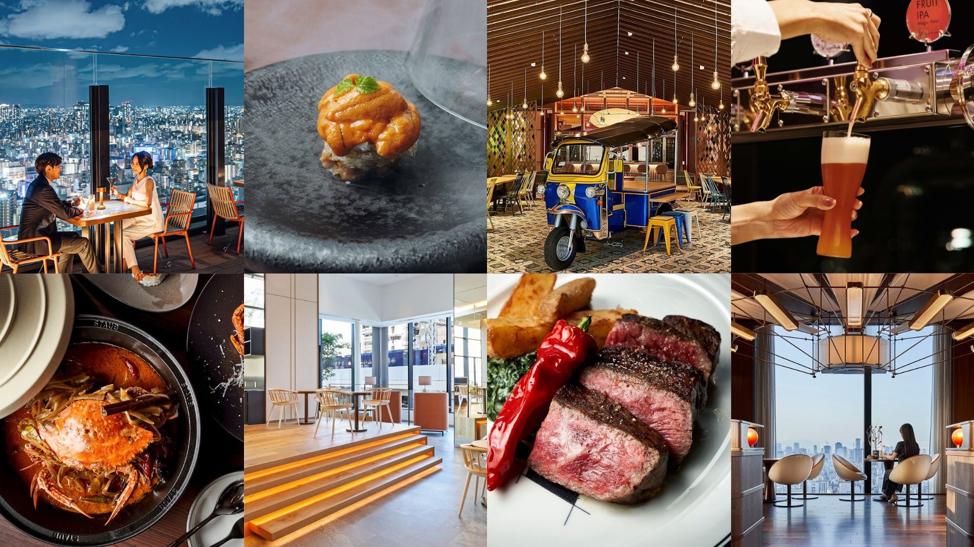 館内には8つのレストランとバーがあり、地上135mの空間で大阪の絶景が見渡せるルーフトップレストラン「クルードデッキ」のほか、和の食材に燻製の要素を加えてフレンチの技術で調理した料理が堪能できる「燻製キッチン」、熟成肉のステーキを提供する「ステーキハウス ウイスキーノヴァ」、本場の味をお届けするタイ料理レストラン「スアンブア」など、プランに含まれる5,000円のクレジットで幅広いダイニングエクスペリエンスをお気軽にお試しいただけます。