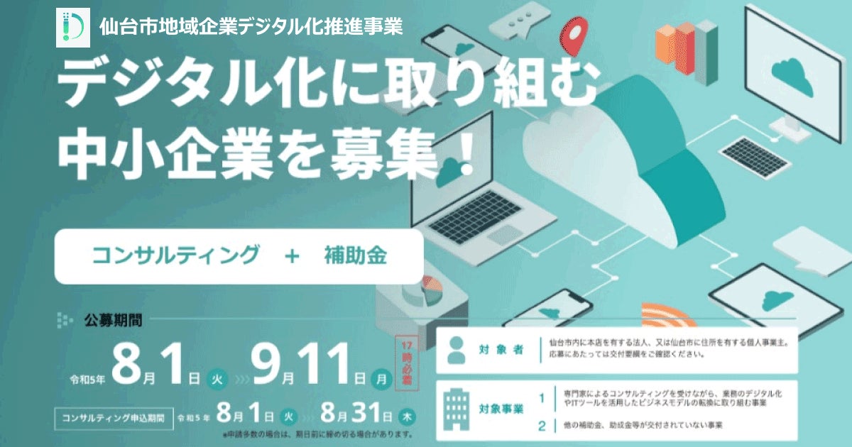 仙台市と(公財)仙台市産業振興事業団では、業務効率化等の経営課題の解決にITツール等を活用して生産性向上や競争力強化等を図る取り組みを支援するため、「仙台市地域企業デジタル化推進事業」を開始しました。