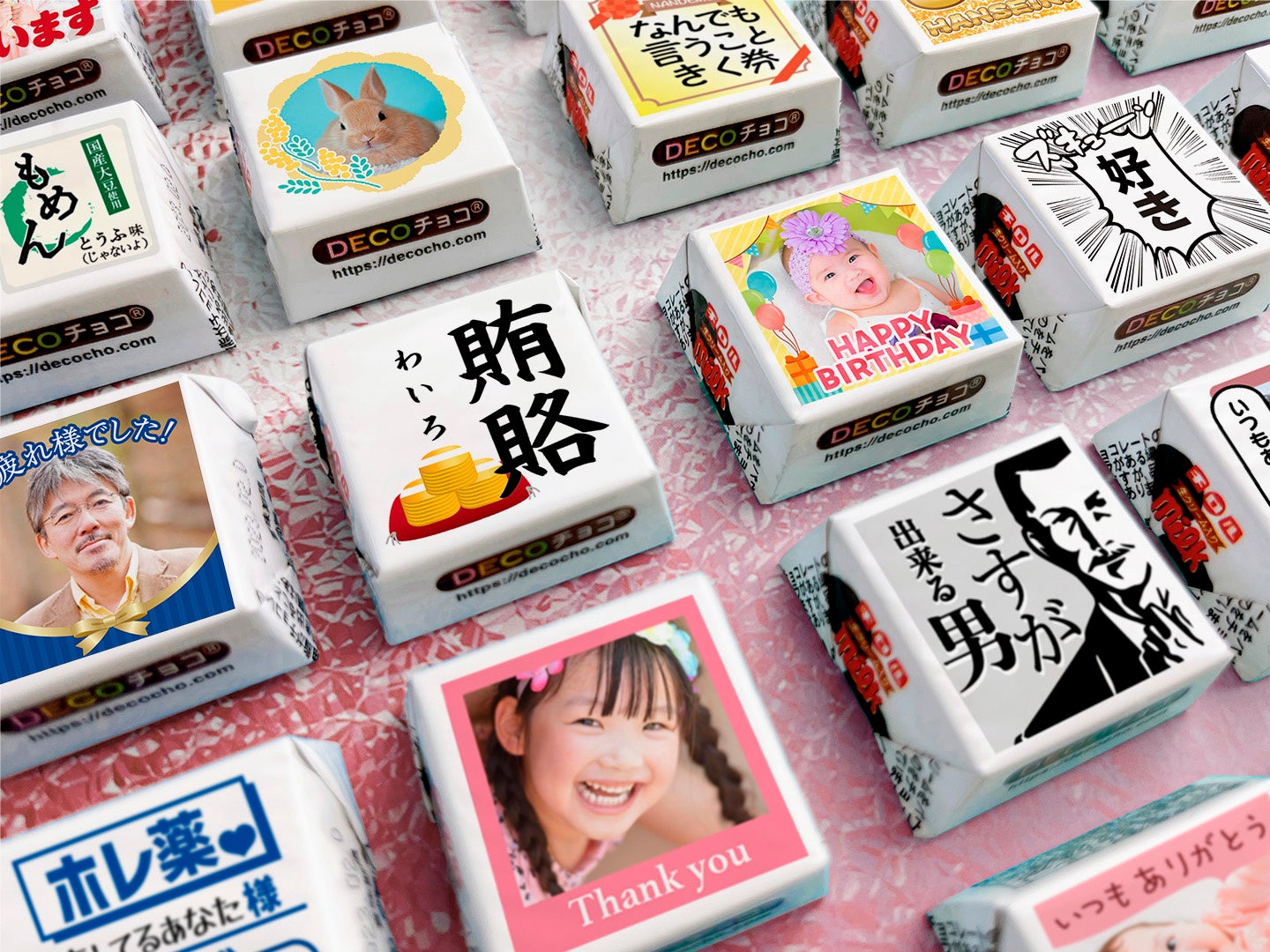 「DECOチョコ」は、世界に1つだけのオリジナルチロルチョコが作れるサービスです。Webサイト上で、お客様ご⾃⾝で写真や⽂字等を⼊れていただき、オリジナルチョコを作成、短納期でお届けします。