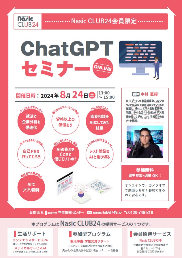 株式会社学生情報センター(京都府京都市、代表取締役社長 𠮷野 一樹、以下、ナジック)は8月24日(土)にナジックが管理する学生マンション入居者向けサービス「NasicCLUB24」のプログラムとして、入居学生と保護者を対象に「ChatGPTセミナー」を開催しました。