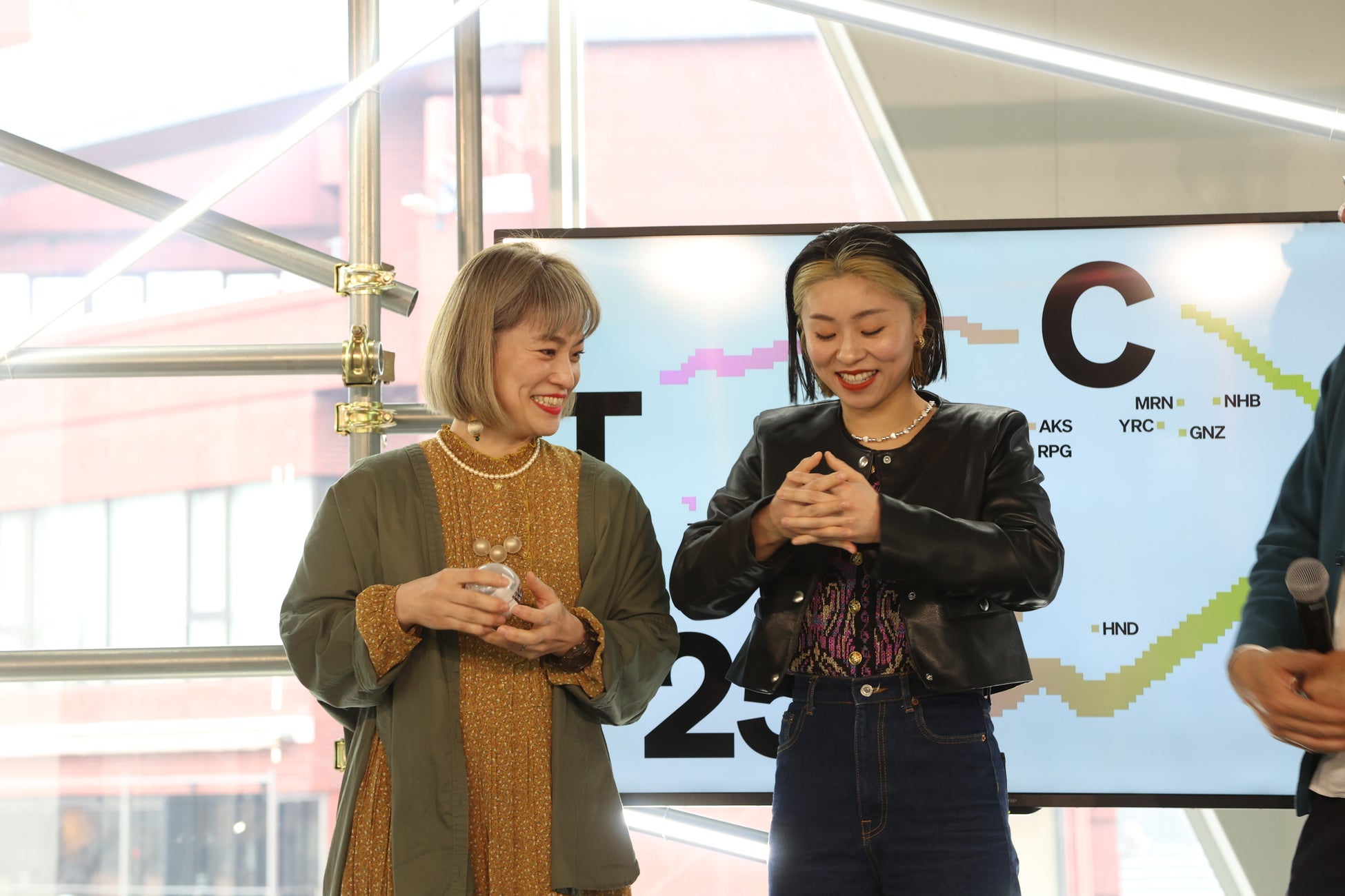 また、多くのクリエイターとの共創を目指し初開催された「TCS Open Call 2025」の受賞者代表として伊藤愛さんと神亜優さんが実際にガチャを体験しました。