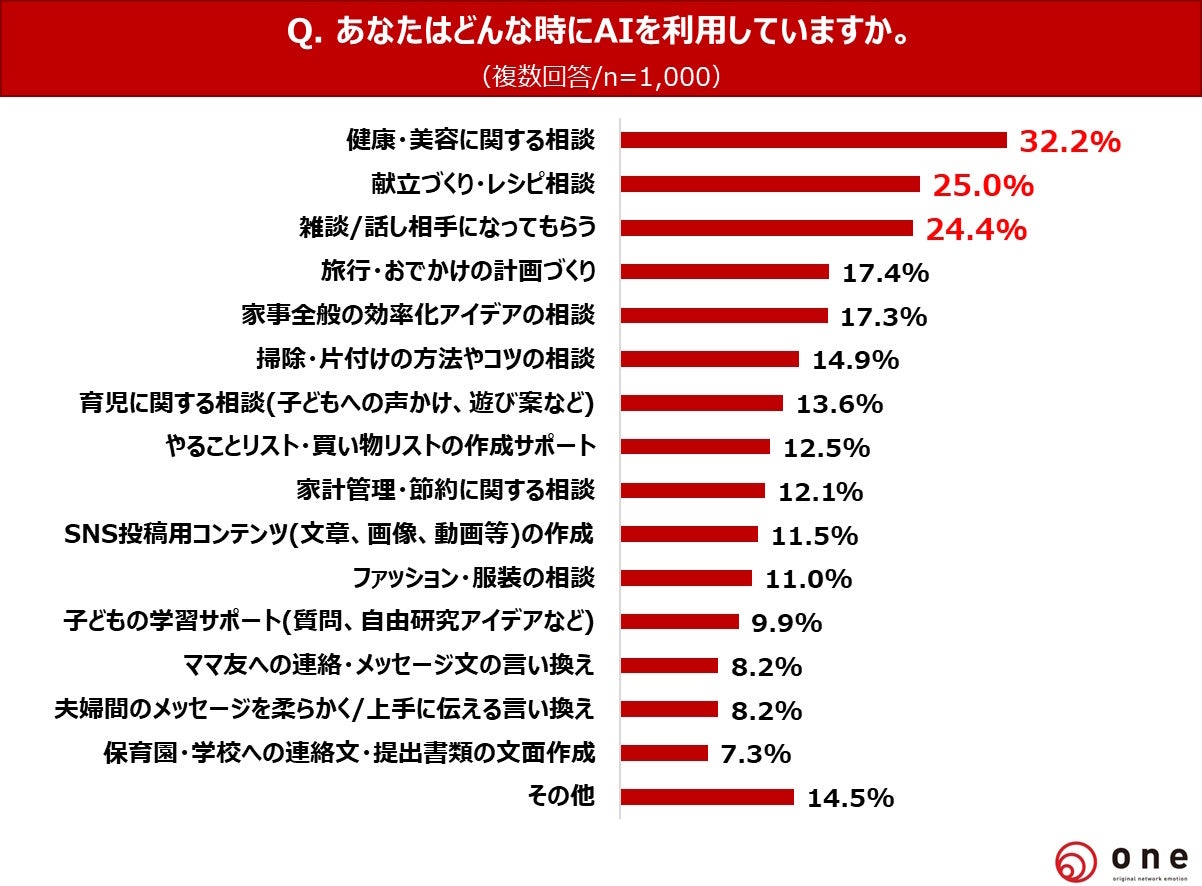 マーケティング支援事業を手掛ける株式会社one(本社:東京都新宿区、代表取締役CEO:清水佑介)は、2025年12月3日(水)~12月5日(金)の3日間で、全国の18歳以上の既婚女性1,000人を対象に「主婦のAI活用に関する調査」を実施しましたので発表いたします。