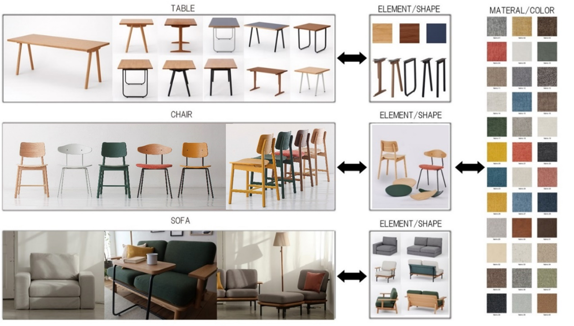 豊富な素材と形状から生活スタイルに合わせて組み合わせることができ、スマートな生活を実現する機能性、長く使い続けられる耐久性、お使いの家具とも馴染む普遍的なデザイン、商品の経年劣化に伴うメンテナンスや修理のしやすさが特徴です。カテゴリーは、チェア、テーブル、ソファ、シェルフを展開し、順次広げていく予定です。