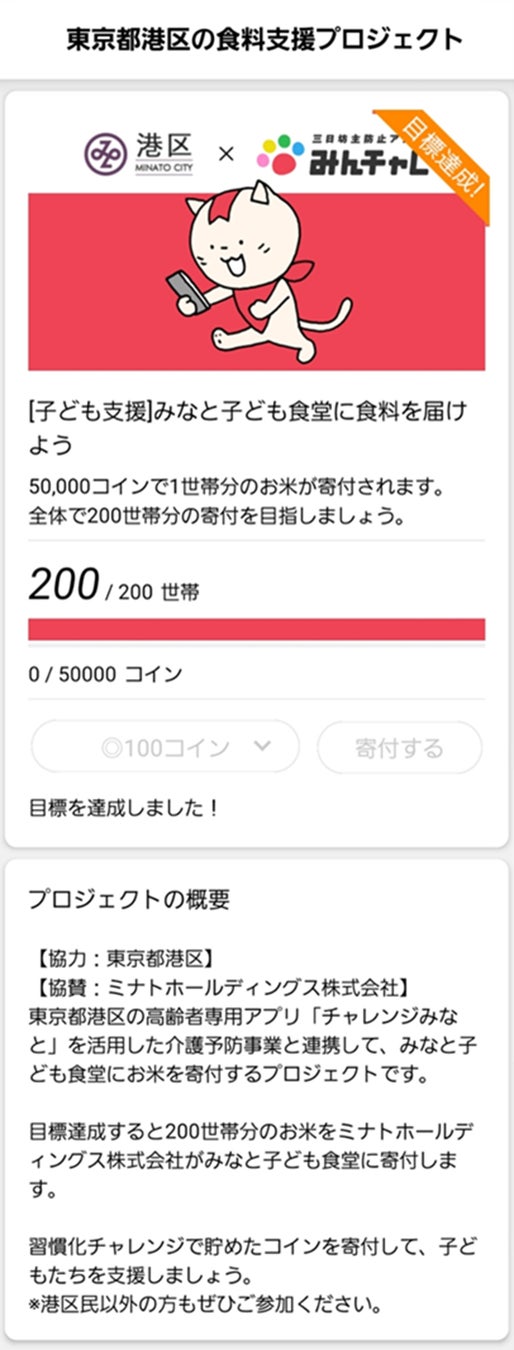 アプリ利用者がチャレンジを続けることでコインを獲得し、貯まったコインはアプリ内の港区の寄付プロジェクトへ寄付することができます。寄付されたコインが目標数に達すると、ミナトホールディングスから「みなと子ども食堂」へ、お米の寄付が実施されます。