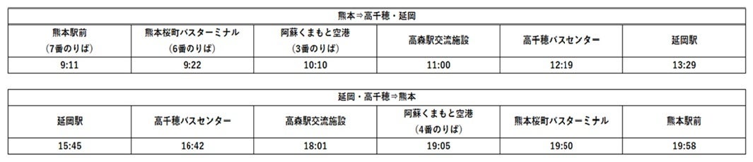 交ぜ、TV アニメ第2 期「プライベート編」の舞台を連想させるデザインとなっており、多くの方に高千穂町へお越しいただきたいという想いを込めております。ラッピングバスは、2024 年11 月1 日(金)より熊本~高千穂~延岡間を運行する都市間バス「特急たかちほ号」(九州産交バス便)において、コラボ期間の2025 年3 月31 日(月)まで期間限定で運行いたします。該当便および主要バス停通過時刻は以下の通りです。