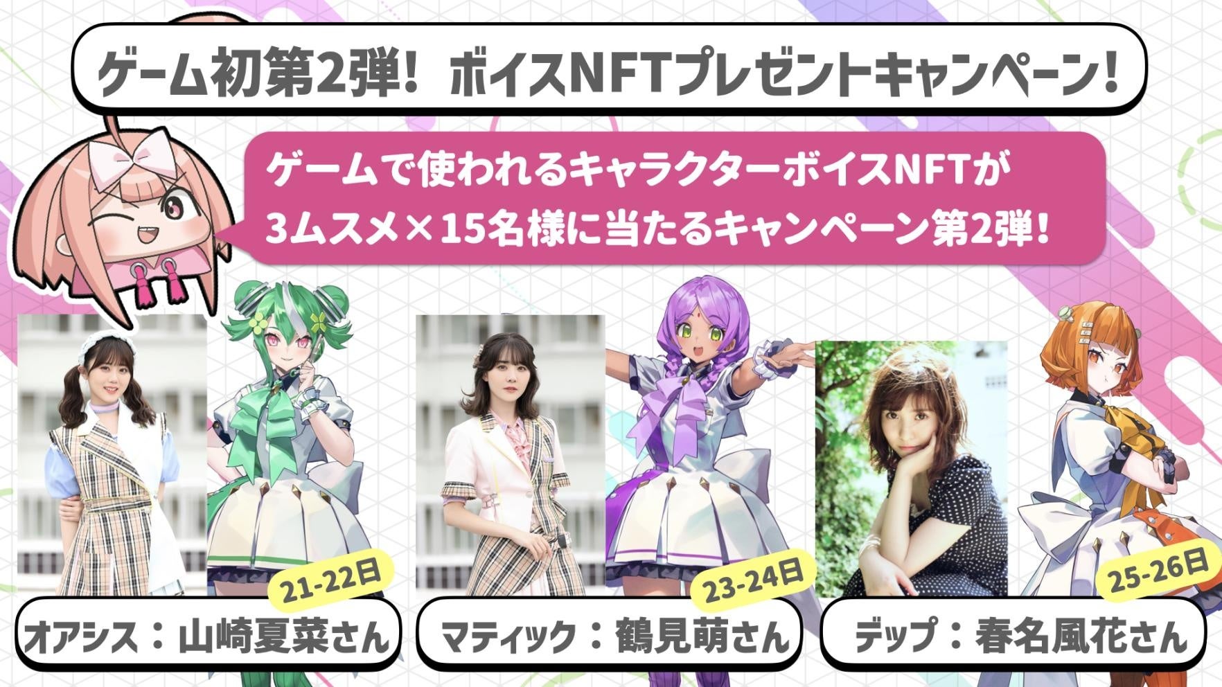 ブロックチェーンゲーム「コインムスメ」、登場キャラクターの「オアシス」「マティック」「デップ」担当声優のボイスNFTが当たるキャンペーンを実施。
