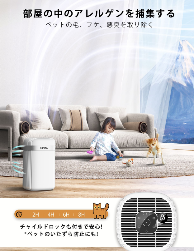 2/4/6/8Hのタイマーと3段階風量調整機能が搭載され、空気清浄機の利便性が高く、自由に調整できます。チャイルドロックで赤ちゃんやペットのいたずら防止にも役立たてます。