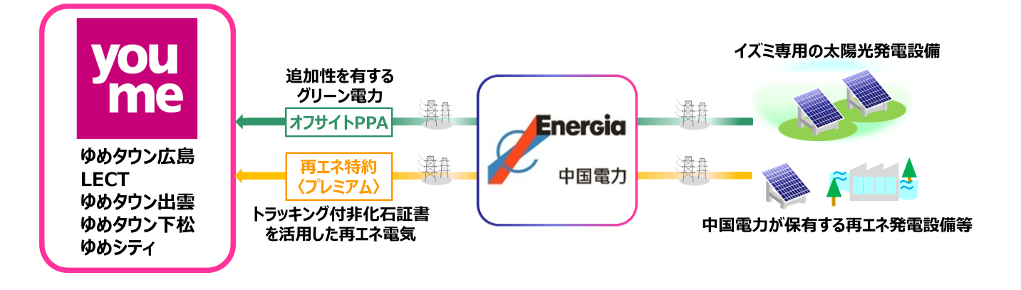 株式会社イズミ(以下「当社」)と中国電力株式会社(以下「中国電力」)は2024年7月1日(月)に、当社が運営する中国地方にある5店舗(ゆめタウン広島・LECT・ゆめタウン出雲・ゆめタウン下松・ゆめシティ)について、使用電力の100%を再生可能エネルギー(以下「再エネ」)で供給する契約を締結しましたので、お知らせいたします。
