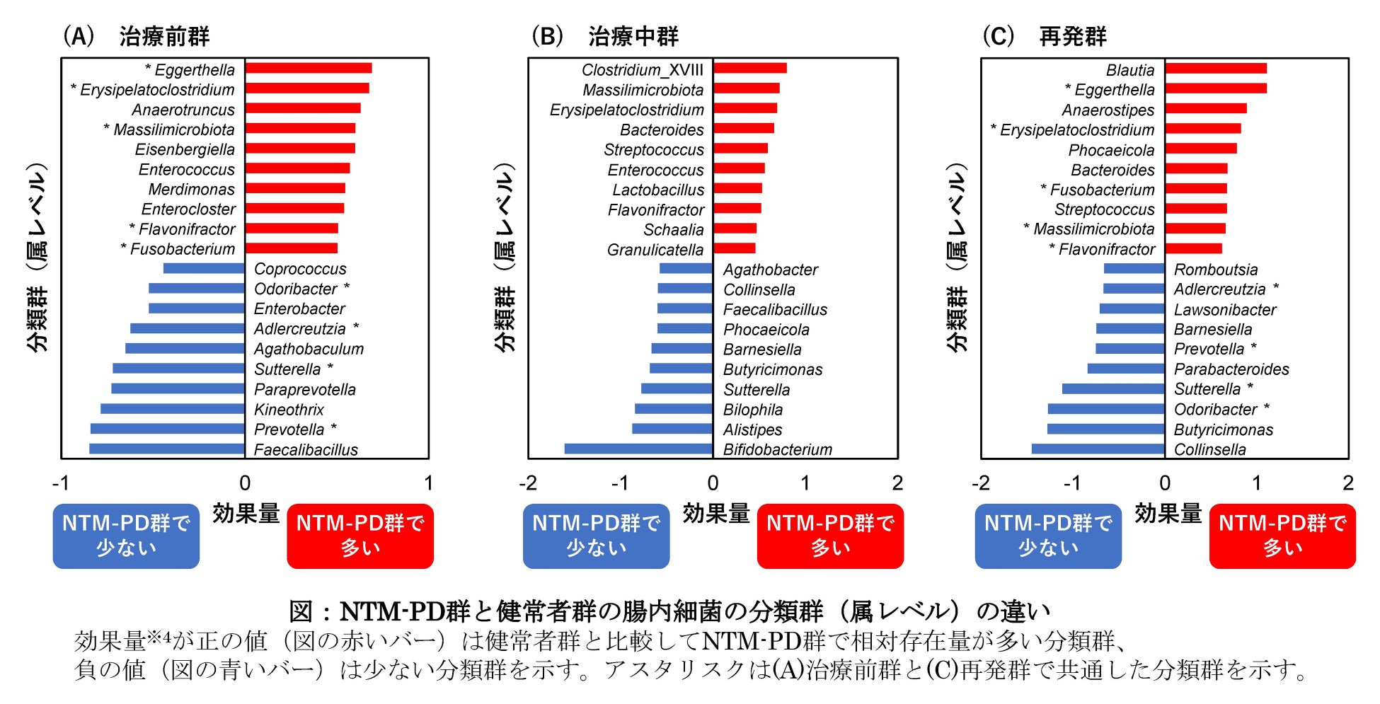 その結果、治療前群と再発群では、Sutterella、Adlercreutzia、Odoribacter、およびPrevotellaの相対存在量が健常者群と比較して少ないこと、Erysipelatoclostridium、Massilimicrobiota、Flavonifractor、Eggerthella、およびFusobacteriumの相対存在量が健常者群と比較して多いことが共通していました(図中AおよびCのアスタリスク)。これらの腸内細菌はNTM-PDの罹患に関連している可能性があります。