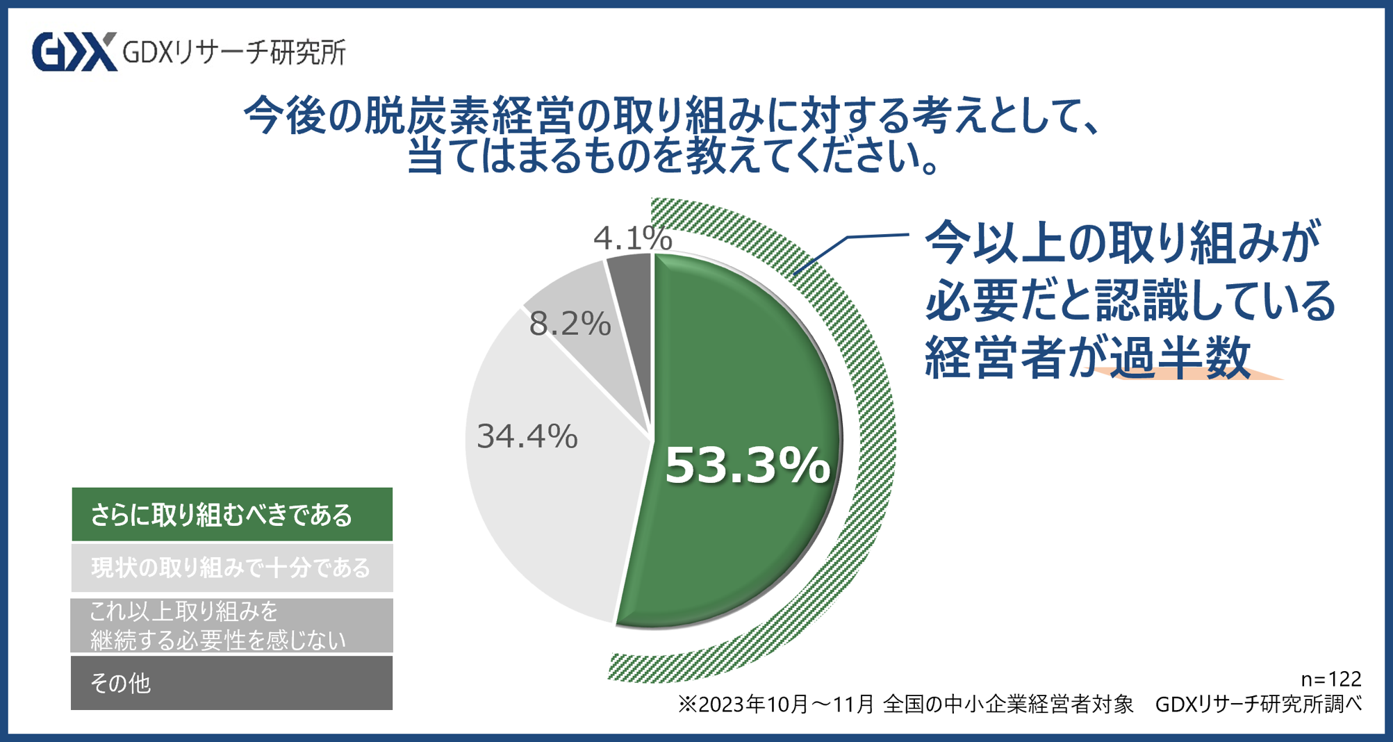脱炭素経営に「十分取り組めている」「ある程度取り組めている」と回答した方に、上記の質問をしたところ、「さらに取り組むべきである」と答えた経営者は全体の53.3%となり、今以上の取り組みが必要だと認識している経営者が過半数という結果となりました。