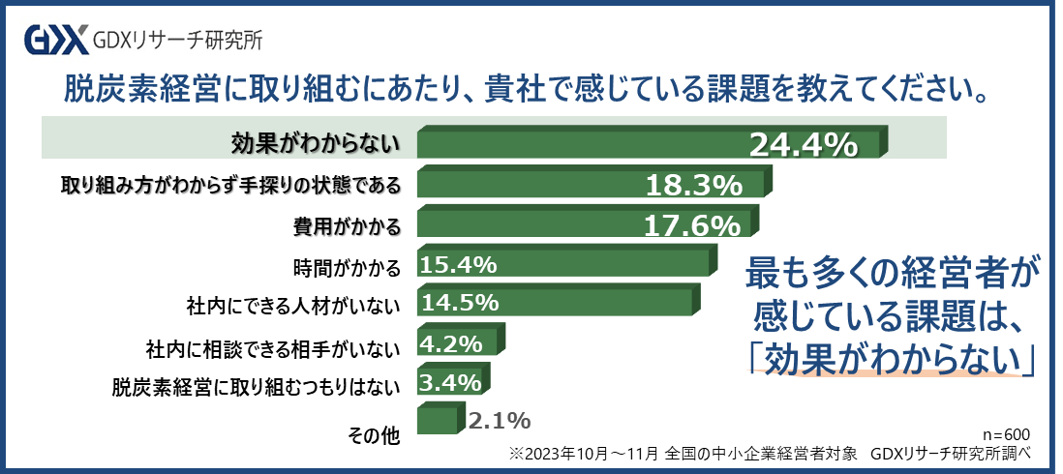 「効果がわからない」が全体の24.4%で、最も多くの経営者が感じている課題であると判明しました。その他では「取り組み方が分からず手探りの状態である」(18.3%)「費用がかかる」(17.6%)と続きました。