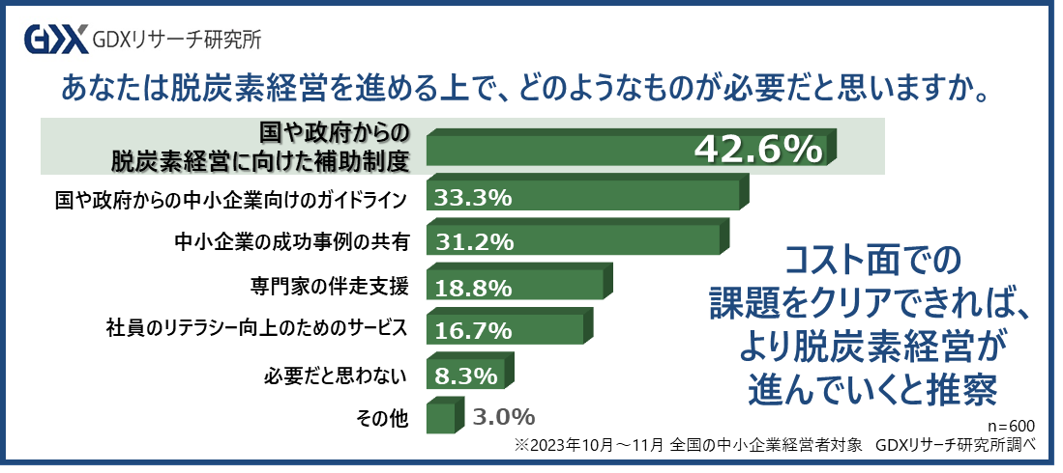 これまでの調査から、中小企業にとって脱炭素経営に取り組む上ではコスト負担もひとつの障壁となっていることが分かります。こちらの設問でも「国や政府からの脱炭素経営に向けた補助制度」が42.6%となり最も多くなりました。中小企業への補助制度によってコスト面での課題を解決することができれば、脱炭素経営はより進んでいくと推察されます。