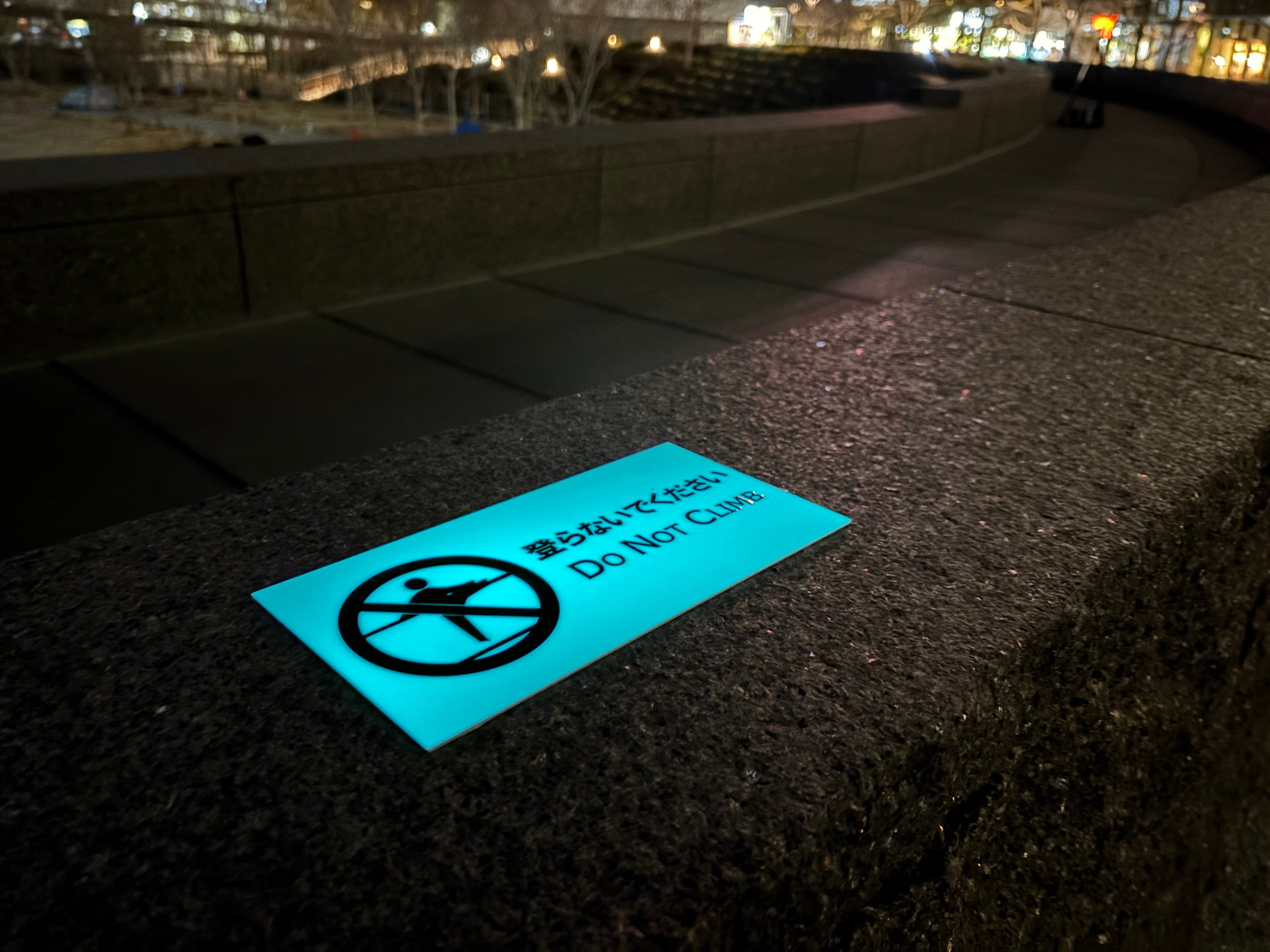 本事例では、都市の中心に広がる芝生空間と共存しながら、夜間の安全性や注意喚起を成立させる新しい空間デザイン手法として、蓄光素材を用いたサイン・注意喚起ユニットが設置されました。