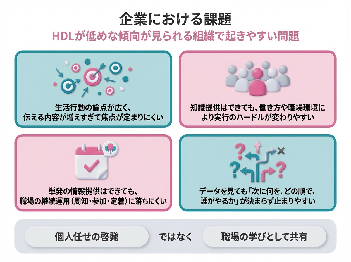 HDLが低めな傾向が見られる組織では、次のような主な課題が起きやすくなります。