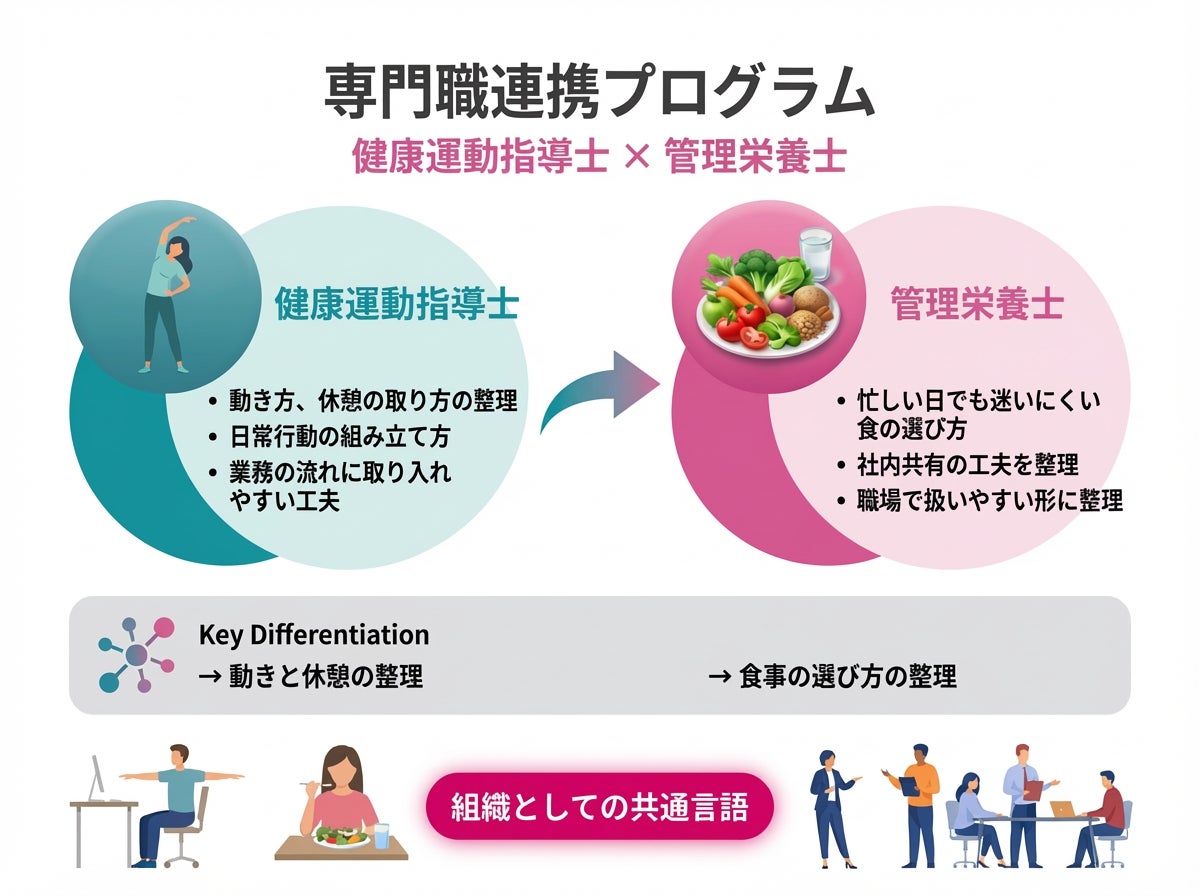 ・健康運動指導士と管理栄養士が連携し、生活行動の考え方を職場で共有しやすい形に設計します。
