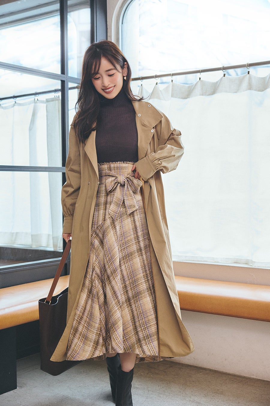 秋に定番のチェック柄を、ばさっと羽織ったオーバーコートで今年らしくアップデート。ループヤーンを用いたオリジナル柄のチェックスカートはハイウエストデザインで脚長効果も。