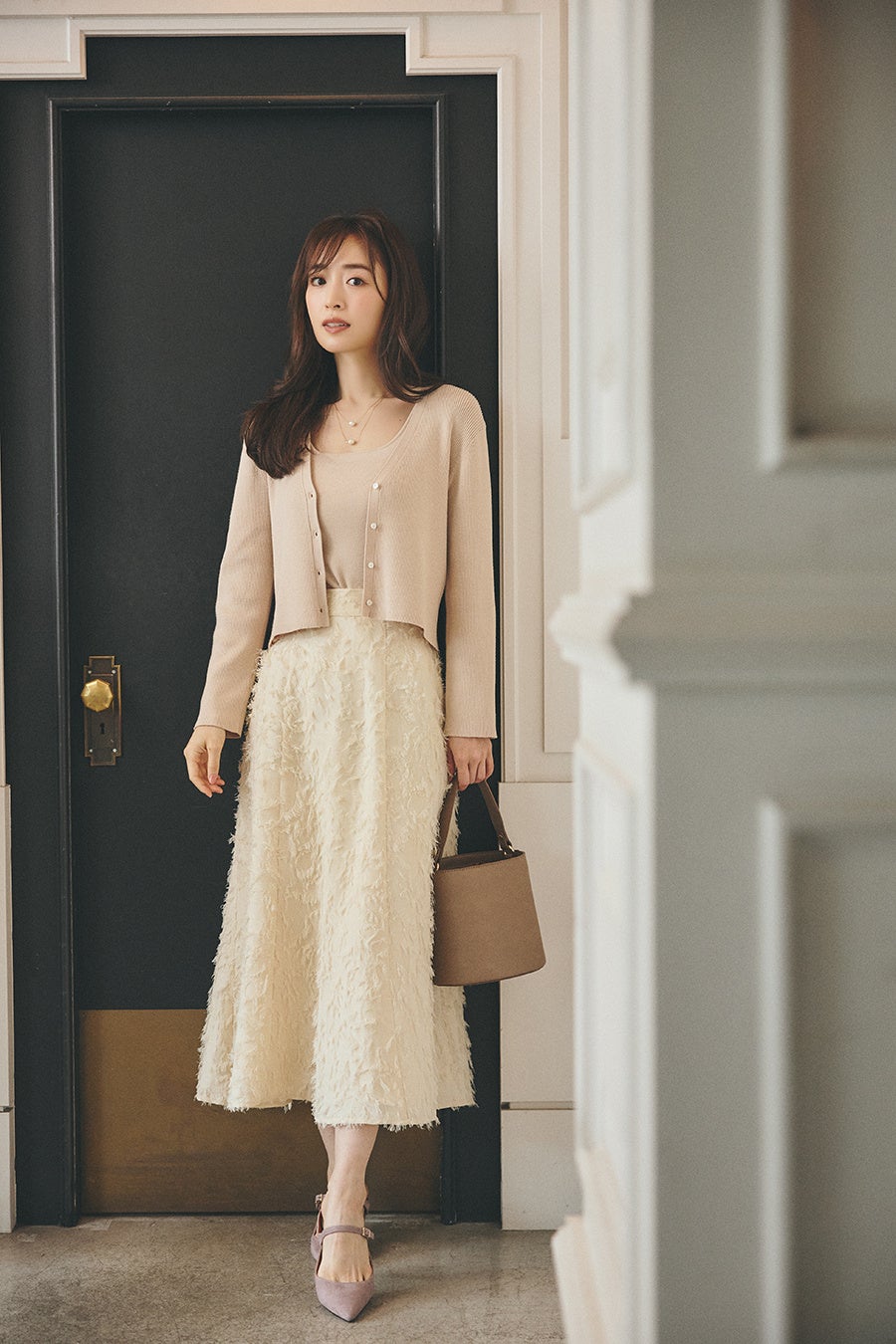 毛足の長いジャカードスカートを主役にした、まろやかなミルクティーカラーのコーディネート。コンパクトなアンサンブルニットがスカートのボリュームを引き立てます。
