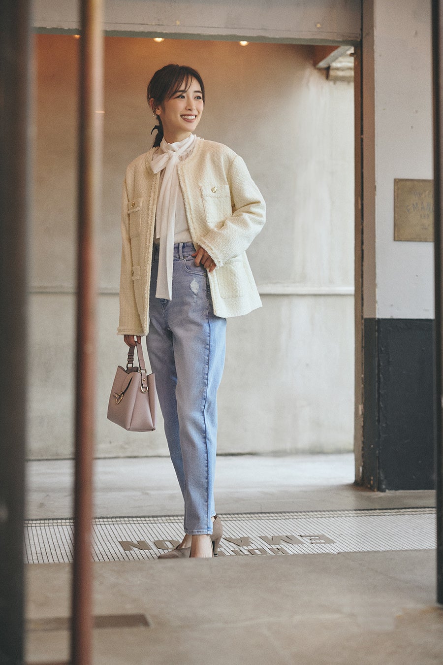 クラシカルなムード漂うツイードジャケットは、この秋もマストでスタンバイしておきたい。ラメ糸でリュクスに織り上げたファンシーツイードを、ドロップショルダー&1枚袖のデザインで堅苦しくなく斬られるデザインに仕上げています。ボウタイブラウスとデニムでカジュアルダウンさせて。