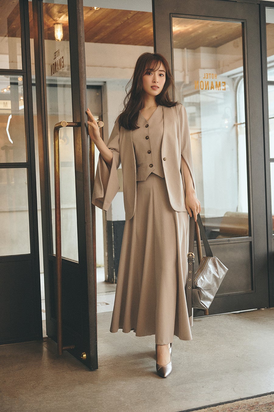 トラッドな佇まいとエレガンスが同居するジャケット・ベスト・スカートのスリーピース。かっちりとした印象を与えながらも、スカートのたっぷりとした揺れ感やジャケット袖のファスナーから覗く肌がどこかセンシュアルなムード。