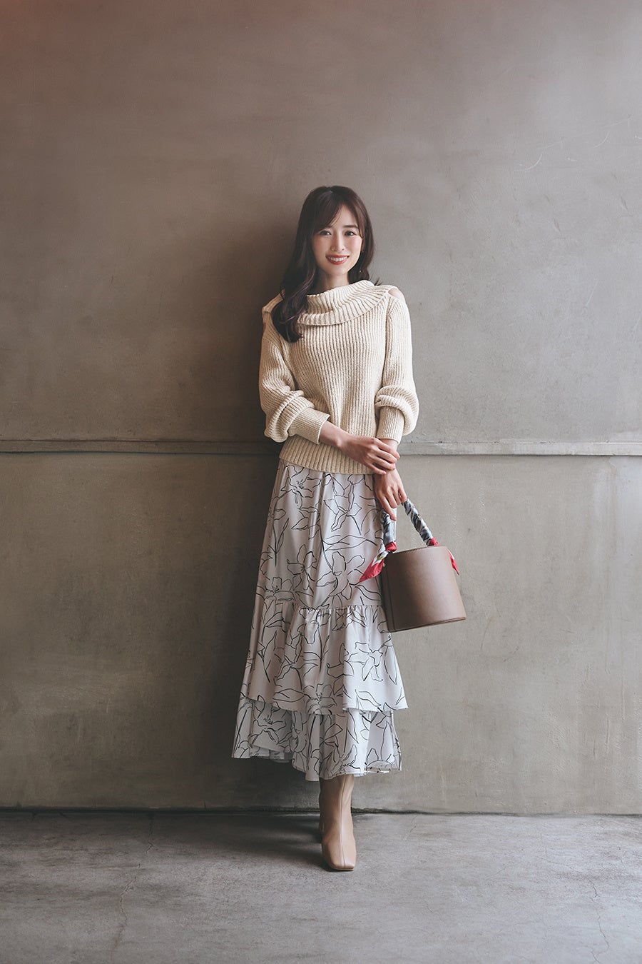 大花の線画花柄とイレギュラーヘムデザインでロマンティックに仕上げたスカート。肩あきニットと合わせてゆるりと女っぽく、リラクシーな着こなしを楽しんで。