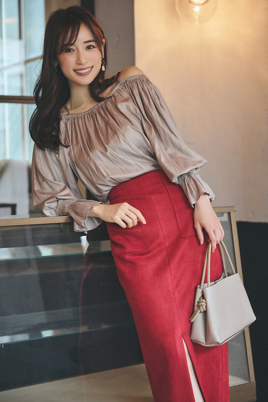 トレンドカラー・レッドを取り入れたブラウス×スカートのワンツーコーデ。ブラウスの光沢素材とスエードスカートのマット素材、マテリアルを掛け合わせて生まれるドラマチックさを楽しんで。